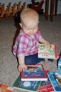 Gwen loves to "read" books. She got right to work checking out her Christmas books.