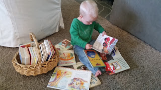 I love that all of our kids love to read and look at books. He carried this entire basket of books over by the kitchen and plopped himself down on the floor to read them.