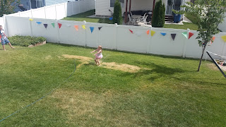 Friday afternoon was spent playing in the backyard. They played in the sprinklers and then set the slipn' slide up again. Caleb decided he liked it finally and spent a good chunk of his day jumping in the pool of water at the end of the slipn' slide. He was happy as can be!